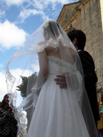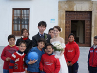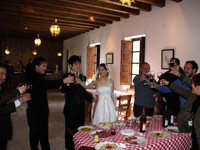 写真撮影の後、修道院の外に出ると、ものすごい量のライスシャワーに出迎えられました。まさにシャワー!向こうの人は、ふわっと投げるんではなく、ほとんど投げつけるように浴びせるんですね。ロマ族の人達がフラメンコを歌ったり踊ったり、おばちゃんたちに次々話しかけられたり、写真撮影があったりテレビのインタビューがあったり、もう大騒ぎでした。