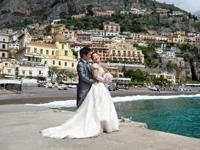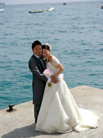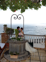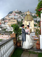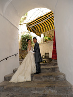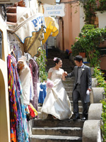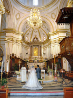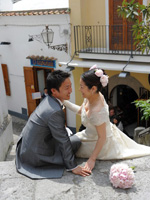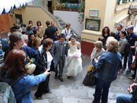 最初は教会への道の途中で恥ずかしいから誰にも会いませんように・・・、と願っていたのですが、ホテルの部屋を出て廊下でまず宿泊客のご夫婦にcongratulations!と声をかけて頂き私の願いは叶わず・・・。ホテルのロビーを出たらあっという間に人だかりが出来ていました。たくさんの観光客の皆さんにアウグーリ!とカメラを向けられ教会まで5分の道のりを30分くらいかけてカメラマンのマッシモさん、あきこさんと歩きました。 |