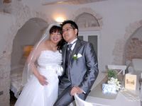 さて、挙式および新婚旅行について少し報告したいと思います。成田を出発し、ローマに着きバーリ行きへ乗換に少々迷い、なんとか無事乗れましたが、日本人は私たちだけでした。バーリの空港に着き、ぼーっと15分くらいお迎えを待っていたのですが、どうも見当たらなくて、瀧本さんに連絡してみたところ、これから1時間くらいかかるとのこと。日本人もいなくて、ちょっと怖かったです。無事、超かわいいトゥルッリに到着して、その日は就寝しました。