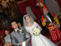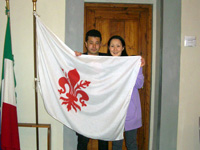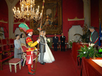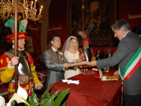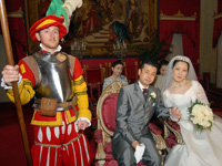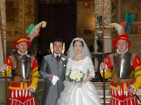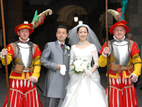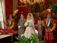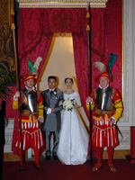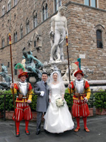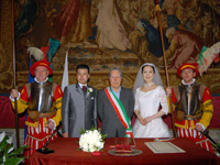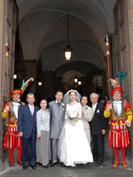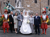 さてさて挙式当日、朝は曇時々雨。ずっと住んでいたいくらい素敵なホテルの部屋にイタリア人のヘアメイクさんが来てくださり、順調に準備が進みました。いざヴェッキオ宮殿へ。素敵な衣裳の衛兵さんが入り口から付いて下さいました。 |