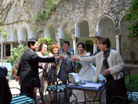 マッシモさん率いるフォトツアーが終わり、Hotel Luna Conventoの中庭で、サプライズでシャンパンのサービス!またまた感動し、渇いた喉を潤しました。それまでは、カンカンに晴れ、空も海も真っ青☆ところが戻って部屋で一息ついてたら、雷雨が!明け方は霧が立ち込めていたようで、雨の予報だったそうです。…私達はとてもラッキーでした。神様はいつも私達を見ていてくれたのかと思いました。 |