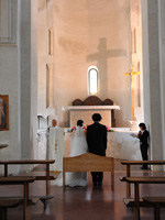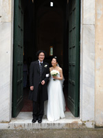 教会は写真を見て、形の美しさと白色のシンプルさが一目で気に入り、神父様も人柄がよいということでしたので決めました。挙式の日はあいにくの雨で、傘を差して教会に向かいました。雨ということもあり、すれ違う人に「アグ〜リ」とたくさん声をかけてもらいました。教会では神父様がイタリア語で説教をされますが、佐々木さんが丁寧に訳してくださいました。細やかな対応に感謝いたします。 |