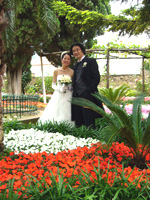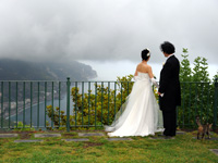 山には雲がかかっていたり、霧も出てきたり、青い海!ではありませんでしたが、それでもお花の咲いた綺麗な庭や石畳の階段、何気ない路地、ドゥオモの広場などで撮影しました。どこを撮っても素敵な場所ばかりです。挙式の前と後日はすばらしく晴れた天気だったのが、今でも不思議でしょうがありません。それがよけいに印象深い結婚式となりました。 |