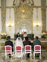 山田葉子さんが迎えに来てくださり、ジャガーに乗ってミラベル宮殿へ。天使の階段をのぼり、婚姻の間・マルモアザールへ向かいます。宮殿ですし、現在はザルツブルク市庁舎とのこと。我々のほかにも婚姻式を挙げるカップルやその家族らが先にいらっしゃいました。国籍も多様で、それぞれ異なる雰囲気があり、とても興味深かい印象から始まりでした。 |