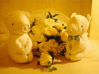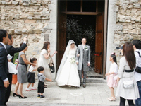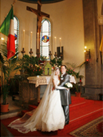| いよいよ式が始まり、新婦の父と一緒に新婦入場です。 教会に入ると前方に綺麗なステンドグラスが見え、新郎との新婦の父の握手・・・そしてブレッシングが始まりました。 神父さまの言葉を通訳してもらいながら、二人で誓い&指輪の交換&署名。お祈りするところはとても感動的でした。 |