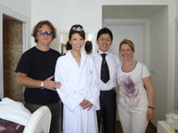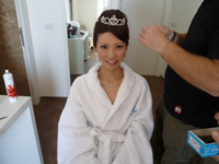 挙式当日、通訳の佐々木さんと当日の段取りについて打ち合わせした後、現地の方にヘアメイクをしていただきました。ヘア、メイクともに現地の方でしたが、佐々木さんを介してコミュニケーションにはまったく問題なかったです。ヘアスタイルは最初、簡単にイメージをお伝えしましたが、お任せでセットしてもらいました。カーラーを使わず、ピンだけでとても手早く仕上がりびっくりしました。メイクは、薄付きなのに全く崩れませんでした。普段もこんな風にできたらいいのに・・・。さすがですね(笑)メイクをしている時に、「前日にリップを無くしてしまって・・・」という話をしたところ、「よかったらどうぞ」とリップをいただき、大変助かりました。ヘアもメイクもどちらも大満足です。
