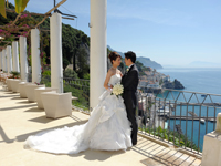 挙式は、『歴史ある街並みの中で、かつ青い海と空をバックに!』という私たちの理想にぴったりのアマルフィ・サンタ・トロフィメナ教会に決めました。 ホテルは、アマルフィの歴史的修道院ホテル「カプチーニ・コンヴェント」をリニューアルしたばかりの「グランドホテルコンヴェントアマルフィ」を手配していただきました。断崖絶壁の上に張り付くように建てられており、かなり高い場所からアマルフィ海岸を見渡すことができます。テラスや部屋の窓からの眺めは絶景でした。白が基調の部屋はとてもきれいで、壁には昔の修道院の床タイルが飾ってあったり、雰囲気がとてもよかったです。私たちがこのホテルがリニューアルオープンして、はじめてのウェディングだった様です♪