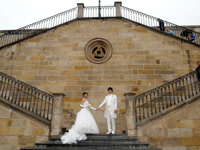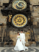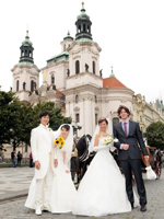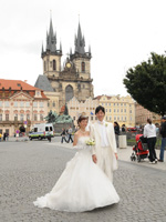 | 教会の門から出ると、井口さんや通訳さんたちからのフラワーシャワーが待っていました。私たちは、2人きりの挙式でしたが、街の人たちからも祝福をいただき、とても大勢の人から祝っていただきました。こうして、挙式は終了。 続いて、フォトツアーです。プラハ市内の各名所を巡りました。メルセデスベンツで廻りました。ステキです。まずは、挙式後、旧市街広場にて。聖ミクラーシュ教会やティーン教会、時計台をバックに撮影。さらに、プラハ城、カレル橋と、名所を巡り巡りってたくさんの写真を撮りました美しい街並みと、街の人々からの祝福とで、本当に素敵な時間でした。途中、ロシア人カップルのフォトツアーと合流し、一緒の写真を撮ったことも印象的でした。現地で私たちをサポートしていただいた方々、祝福を送っていただいた皆様に感謝いたします。 |