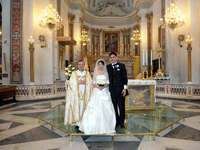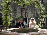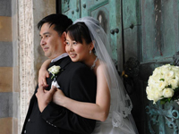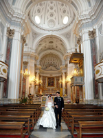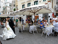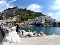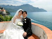 話はそれましたが、桟橋では観光客の方々に拍手していただいたり、船から汽笛を鳴らして祝福してくれたりととてもうれしかったです。その後はとなりのミノーリという街に移動し、サンタ・トロフィメナ教会で挙式。いままでのリラックスムードとは違い、素晴らしい教会の内部とパイプオルガンの演奏に心がピンと引き締まりました。長いヴァージンロード、高い天井と素晴らしい装飾、日本ではまずないでしょう。 神父様に祝福していただき、証明書にサインしました。私達の名前がこの教会にずっと残るのかと思うと、とても考え深いものがありました。挙式後はまた街に戻ってメインストリート、大聖堂での撮影。ここでは沢山の人たちにおめでとう!と祝福していただきました。英語だったり、イタリア語だったり。握手を求めて下さる方もいました。後で聞いたのですが、涙ぐんでいる方もいたらしいです。結婚式って自分だけではなく、みんなも幸せな気持ちにしてくれるのだなあ〜と思いました。 |