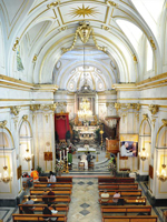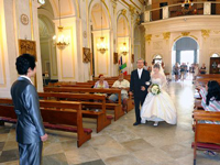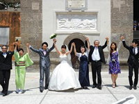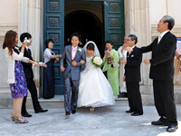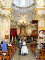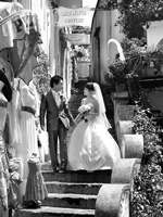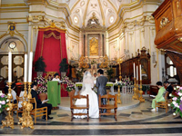 | 挙式後に日本のお土産を渡すと、ちゃめっ気たっぷりに笑って喜んでくれましたよ!そして彼のお母様が鶸色のお着物を召されており、その緑色が壇上左手に飾られた物とよく似た色で神父さんがお母様に話しかけていました。気を良くされたのか、ポジターノの絵が描かれているカレンダーをプレゼントしてくださいました。挙式後もまだ続きます! | |||||