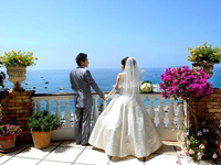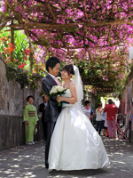 | さて!挙式についてお話させていただきたいと思います!関空からはローマ着のアリタリアで12時間。伊丹から来られた彼のご両親とローマで合流し、ユーロスターでナポリへ。ナポリに着いたのは夜の10時。辺りも暗かったので、(特にナポリは治安が悪いこともあり)事前にバスをお願いして大正解でした。自称ラテン一家の私達は(彼の家族はドイツ系らしいです)疲れた体を休ませる訳がなく、ナポリピッツァ&ワインを求めて、夜のサンタルチアへ♪直径40cmはあるかと思われるピッツァがなんと600円!ふわふわもちもち、そしてまん丸いモッツァレラチーズに癒されました。 2日目は、お昼過ぎまでナポリを観光した後専用車にてポジターノへ。山田さんの提案もあり、途中でアマルフィに寄っていただきました。キラキラ輝く海に色とりどりのパラソル。街の中を歩くとレモンテイストのお土産が沢山!有名なカテドラルも見学できて皆大満足でした。アマルフィからまた曲がりくねった道を走ること30分。ついに、待ち焦がれていた町ポジターノに入りました・・・!「わぁ〜〜〜〜〜素敵!」 山の斜面に建てられた色彩豊かな建物、フューシャピンクのブーゲンビリア、そして町のシンボルのレモンが目に飛び込んできます。まさに宝石箱のような眺めです・・・。 手配してくださったホテルは、ホスピタリティーの高いホテル。皆さん快く接してくださいました。何より嬉しかったのが、お部屋のテラスから壮大なポジターノの景色を一望できることです!!ポジターノを独り占めという感じでしょうか(笑)「明日はこんなすごい場所で挙式をあげるのか・・・」 次第に緊張してきました。式の前夜は両家揃って、山田さんオススメのレストランへ。モダンな店内でいただくフルコースはどれも絶品でした。両家揃って・・・というのは結納以来だったのでお互いの距離が縮まったような気がして嬉しく思いました。 挙式当日。トントン。 「佐々木と申します。サルバトーレ山田からのFAXです!東京から気を送ってくれているそうですよ!」とブーケの入ったBOXと共にご挨拶しに来てくださった佐々木さん。この日の通訳・アシストを細やかに、丁寧にしてくださいました。当日の朝にわざわざ東京からFAXをしてくださったのが、サプライズの始まりでした・・・! 山田さんのお蔭もあり、空は雲ひとつない青空に恵まれました。佐々木さんから挙式のスケジュール、フォトツアーについて説明を受けた後、緊張が高まる中“サンタ・マリア・アッスンタ教会”へ向かいました。教会までは家族と一緒に歩いて行ったので、だんだん緊張がほぐれ、街中の人たちが“アグリ!(おめでとう)”と祝福してくれて幸 せな気持ちで満たされました。 |