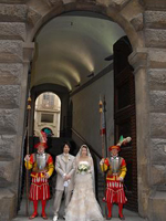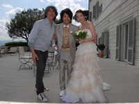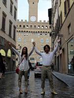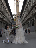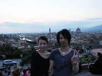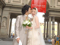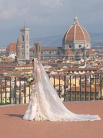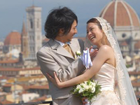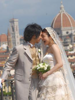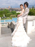 ローマ経由でフィレンツェ入り。フォーマル挙式ならば、ローマでの入国スタンプが必須という事でしたが、すんなりとは押して貰えませんでした。勿論、係員に押してもらえるよう書かれたメモまで見せましたが…。あと、国際線から国内線への乗り換えの際、地理を把握できてない事の厳しさに直面!(スマートフォンも持ってないしね)インフォメーションに行き、チケットを見せながら「どこ、どこ」。(笑) そしてやっとの思いで搭乗手続きも終わり一息ついていると、いつの間にか搭乗ゲートが変更。(館内放送何言ってるか分からないしね) 結果良ければ全て良しとは言いますが、本当に焦りました。「もう少しで妻に泣いて抱きつくとこでしたよ」(新郎談) 「夫がいなければどうなっていた事か」(新郎作)