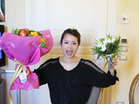 フ゜ロホ゜ース゛でもらった 花束と挙式のフ゛ーケを手に |
