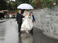 | 式が終わるとなんと天気も奇跡的に晴れて、願っていたスイス湖畔を見下ろす景色をバックに写真撮影もできました。終わった後はまた大雨でしたので・・・本当に奇跡的にあの場所だけ二人のために晴れてくれたのだと思います。ビュルケンシュトック・チャペルでの挙式は妻の夢でもあり、スイスは私が行ったみたい場所でしたので今回ここを選んでお願いしました。オードリーヘップバーンが二度目の結婚式をした場所ということで豪華絢爛ではないのですが、山の中のかわいい、素晴らしい雰囲気のあるチャペルでした。パークホテルも湖畔を見下ろす山の頂という素晴らしい場所にたっており、外界とは遮断された格式のある最高のリゾートという感じでした。これから大規模なリノベーションのため、一時閉鎖されてしまうようですが、その前に伝統と格式のあるそのままの姿の場所で挙式ができて、最高に幸せだったと思っています。