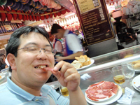10月2日 成田からオランダを経由してスペイン(マドリッド)へ 機内では、大きな紙袋を持った私たちに「それは何なんだ!?」と皆訝しげでしたが、中身がウェディングドレスだと分かると一変「おめでとう!」と祝福してくれました。マドリッド着後、送迎車のドライバーさんと会話しつつ、ホテルへ。予想より早くチェックイン出来たので、晩ごはんがてらに、夜のマドリッド市内を散策しました。混雑するBarのカウンターに体をねじ込み、生ハムとビールで、旅の幕開けを祝いました。 |