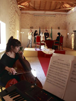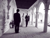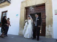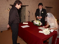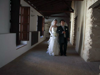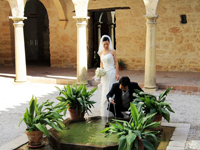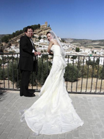 移動中、クラシックカーのクラクションを鳴らしてくれたのですが、この音がおもちゃの車のクラクションみたいな音で、とてもかわいかったです。ホテルから修道院へは、5分足らずで到着します。この日は快晴でしたので、気持ちの良いドライブになりました。修道院に着くと、館長さん始め、皆さんが迎えてくれました。周りにいた街の人からは、祝福のお言葉を頂きました。修道院は、とても雰囲気のある場所で、パティオを囲む回廊を館長さんにエスコートしてもらい、歩きました。歩きながら「いよいよ式が始まるのか」と思うと、少し緊張してきました。新郎と二人で、二階にあるセレモニーホールへ向かうと、階段の途中から、音楽隊の演奏が聞こえてきて、気持ちが盛り上がりました。「いよいよ結婚式が始まるんだな」と感じた場面です。 ホールでは、セレモニーマスターが私たちを迎えてくれました。セレモニーマスターは、終始、真剣なまなざしで私達を見つめていてくれました。そして、愛の言葉を教えてくれました。途中、新郎が大事な台詞を間違えてしまう一幕も交えつつ、指輪の交換と結婚証明書へのサインをし、式は無事終了しました。セレモニーの後は、修道院内での写真撮影を楽しみました。 修道院を出るときには、ライスシャワー!ちょっぴり痛かったです。一旦、修道院を後にし、モンテフリオ市役所へと向かいます。市役所では、街のシンボル「エンカルナシオン教会」をバックにしたり、街の紋章と一緒に記念撮影しました。執務室では、美人市長さん(まだ30代とのこと!若くてビックリ!)にお会いし、市長さんからはモンテフリオ産オリーブオイル等々お土産を頂きました。また、私たちからは栃木県のお土産を渡したり・・・短い時間でしたが、楽しいひとときを過ごしました。市役所前では、忙しく働く警察官や、行き交う街の人にお祝いの言葉を頂きました。市役所の次には、街を見渡せる展望台へ移動しました。展望台へ上がる坂道では、カメラマン達が「他の車がジャマだ」と言い始め、通る車がなくなるタイミングを見計らって、撮りなおしをしました。展望台では、どこかの家から、かすかに聞こえてくるフラメンコの音楽を聞きながら、一番見たかった景色をゆっくり眺めました。すばらしい景色の中で、しかもウェディングドレスという特別な服装での撮影を楽しむことができて心から楽しいと感じた時でした。最後は、修道院へ戻り、ウェディングランチを頂きました。 |