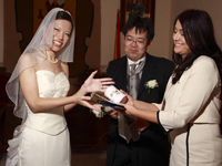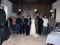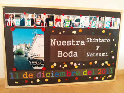 〜その後〜 12月11日 日本で披露宴 ウェルカムボードは、挙式でお世話になった&街で出会ったスペインの皆さんの写真で飾りました。この写真撮影では、現地スタッフさん(平橋さん)が駆け回ってくださり、無事13枚+@の撮影ができました。これも、山田さんが、私の熱意を、しっかりと現地に伝えてくださったからこそ、成功できたのだと思います。スケッチブックの準備&持ち運びが大変でしたが、来場者から「スペインの人に協力してもらったなんて、すごいね!」との声を頂けたので、その苦労も楽しい思い出です。モンテフリオ市役所で頂いた貴重なオリーブオイルは、1本は会場ディスプレイとしてお披露目し、1本は料理のドレッシングとして、来場者にふるまいました。披露宴中は、挙式DVDを上映しました。先輩花嫁達からは「すごく楽しそう!私も海外挙式すればよかった〜。」との声があがっていました。 |
