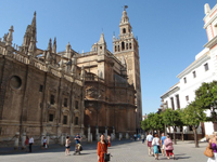 10月6日 モンテフリオからグラナダへ戻り、セビーリャへ 昨日も食べたのですが、今朝も、トマトペースト&オリーブオイルをかけたトーストを頂きました。シンプルゆえ、素材の良さを直接感じられ、ハマりました。本当にトマトがおいしい!出発ギリギリまで朝食を楽しみました。8:00にホテル出発。学校や仕事に向かう人達の間を抜け、朝焼けに浮かび上がる街並みを惜しみながら、モンテフリオを後にしました。グラナダに戻り、バスのチケットを購入し、セビーリャへ向かいました。セビーリャでは、ヒラルダの塔から街を見下ろしたり、今年公開された映画「アンダルシア」のロケ地巡りをしました。また、グラナダに引き続きフラメンコを楽しみました。土地が違うからか、踊りの雰囲気も異なっていたように感じました。 |