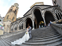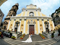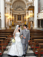 | その後、再び移動してサンタ・トロフィメナ教会へ到着。パイプオルガンの音に合わせて入場。見上げた教会の白と銀に輝く壁や天井の高さに感動です。神父さんと佐々木さんのリードによって、式は滞りなく進み、神父さんとの記念撮影をしてから退場。無事に終わって少しほっとしました。またまた車に乗ってアマルフィの街へ。二人で歩いている写真や、路地、大聖堂前の階段や天国への回廊などなどいろんな場所で撮影していただきました。繰り返しになりますが、この日は本当に大勢の人がいて、「おめでとう」「どこから来たの?」「お幸せに」などなどいっぱい話しかけられ、写真もたくさん撮られました(笑)。式の直前まで、恥ずかしくて素直に喜べないかも…とフォトツアーを怖かっていた二人ですが、蓋を開けてみれば心配無用、幸せ!な気持ちで満たされました。私たちが式とフォトツアーをスムーズかつ安心してできたのは、現地アシスタントの佐々木さんのおかげです。緊張していた私たちをリラックスさせていただいた上、ドレスの着替えやヘアセット、すべての場面で助けていただきました。私たちは二人きりのお式だったので、佐々木さんが家族の替わりに写真を撮ってくれたおかげで、その日のうちに二人の晴れ姿を確認することもできました。写真を見るとやっぱり嬉しいですよね。本当にありがとうございました。