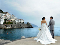 | そして式の当日、時間通りにアシスタント&通訳の佐々木さんがメイクさんと一緒に到着。メイクとヘアセットをしてもらった後、佐々木さんにお手伝いいただいてドレスに着替えました。支度が済んでから、スケジュールの確認。そして、ホテルの中で撮影が始まりました。そこから車でアマルフィの海岸に移動して撮影、この日は天気が良かったので、観光客の人もたくさんいました。そこにいる大勢の人から「アグーリ」とお祝いの言葉をいただきながら、普段は絶対しないポーズでパチリ。最初は恥ずかしかったけど、しばらくすると不思議と慣れてしまいました(笑)