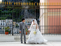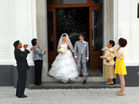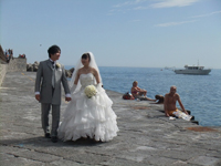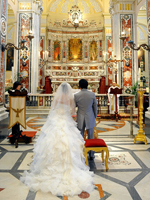 | 式は非常に荘厳な雰囲気の中で執り行われ、アシスタントの佐々木さんやカメラマンのマッシモ、そして神父さんなど、様々な方の協力のもと何事もなく終了しました。 頭の中ではなんとなくのイメージはあったものの、やはり本番ともなると緊張や感動も高まってくるものなんですね。 そして、挙式が終わった後からが濃厚な1時間でした。そう、「フォトツアー」です。挙式前にもフォトツアーについての他の方のレポートはいくつか拝読させていただいていたものの、いざ自分たちがそれをやるとなると、やはり恥ずかしいものですね。特にこの時期は休暇のシーズンでもあったため、いつも以上に多くの観光客でにぎわっており、見知らぬ多くの方々から祝福を受けながら撮影に臨むという、とても貴重な経験をさせてもらいました。 | ||||||