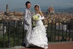 ヴェッキオ宮殿での挙式 当日は天気にも恵まれ、青空に囲まれてフォトツアー・挙式に臨むことができました。フォトツアーはいつもより時間があるとのことで、普段は行かないところでも撮影していただきました。そして何といってもカメラマンのDavidには脱帽!!漫画「ONE PIECE」に夢中の彼は出会いの瞬間から気さくで陽気!通訳の中本さんから、彼はウェディング専門の有名なカメラマンだと聞きましたが、彼の指示する場所・ポーズは全て素晴らしく、撮っている最中も「Bravo!」「Amazing!」の嵐(笑)出来上がりは自分たちとは思えないほどamazingで、こんな私たちを最大限美しく撮ってくれました。 |
