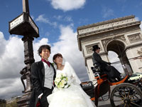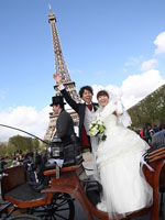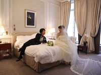 写真とビデオのカメラマンはパリジャンでしたが、ともて気さくで楽しく同行してくれました。日本人の私たちには少し恥ずかしいポージングを要求されましたが、仕上がった写真とビデオは、さすがの素敵な出来でした。 山田さんのスペシャルメリハリプラニングにより、挙式まではパリを代表する高級ホテルの"Le Meurice"に宿泊しました。ホテルのお部屋でドレス姿に準備をし、ラグジュアリーなホテル内で写真を撮らせてもらって、正直お値段はかなり背伸びいっぱい、いっぱいでしたが、かなり良かったです。ホテルから教会までは馬車で移動しました。馬車でシャンデリゼ通りを移動する間中、道行くちびっこの集団、観光客、オープンカフェでおしゃべり中のパリジャン・パリジェンヌ、ドライバーからのクラクション、みんな笑顔で祝福してくれました。もはやパリ中から祝福された気分です。あの日はパリで一番目立っていたかも(笑) あんなに色んな人に笑顔で手を振ったのは最初で最後でしょう。 |