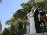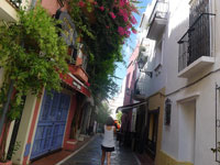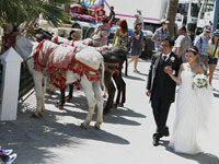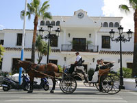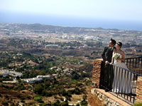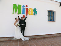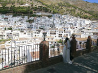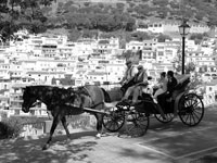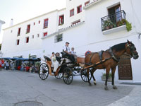 その後、ミハスの村を馬車での観光!!最初は、なんて事のない役所の前の道路を廻っていたのですが、村の内部に入ると景色が一変!狭い路地に家が建ち並び、重なり合い想像していた以上!!高台に入ると眼下に白い町並みがみえ、路地を折り返すと地中海の 海が一面に広がり素晴しかったです!!周囲の観光客や地元の方の祝福はとても温かかったですね。各所でカメラマンのホセさんの多彩なポーズの要求には焦りましたが、いい思い出になりました! |
