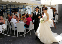 【街の人々からも祝福…フォトツアー】 多くの観光客がいる中でのフォトツアー。最初はとても恥ずかしかったのですが、すぐに慣れました。 沢山の方からAuguri!!(おめでとう)と祝福の言葉をもらったり、新郎新婦とキスすると幸せになれると言われているらしくお母さんぐらいの年齢の女性から祝福のキスをほっぺにもらったりと、日本では体験することの出来ないイタリアらしい祝福にとても幸せで満ち足りた時間を過ごすことが出来ました。帰国後いただいた写真は風景がどれも素晴しく私たちもずっと笑顔で、写真集のような出来映えにとても満足しています。私の希望のprops使用を考慮していただいて、多くの希望の写真を撮ることができたのも大満足です。フォトツアーの写真は、披露パーティの映像やペーパーアイテムにも使用して、ゲストに海外挙式の雰囲気を感じてもらえました。